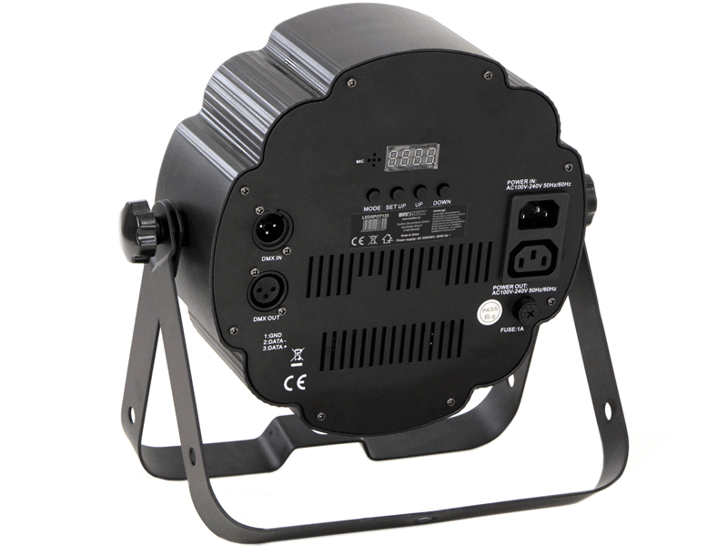 Extremely bright projections and extremely brilliant colors provide the “LEDSpots” of INVOLIGHT. It has a very homogeneous color mixing thanks to excellent, large multi-chip LED’s and is extremely compact and lightweight. The double handle allows use as a floor spot. With around 8 different modes, this headlight uses extremely flexible. You can choose to mix custom colors free themselves, choose a color change mode, which is adjustable in speed and can be covered with a strobe and a color fading Select mode, in which the colors are mixed at any speed smoothly together between different static solid colors. In addition, there is an automatic mode, sound active mode, Master/slave mode and DMX control. In DMX mode, you can control the lights on 7 channels. All modes / settings and DMX addressing can be done easily via the digital on-board menu. By IEC in/out multiple projectors can be operated on a stage without a dedicated power line must be set for each device.