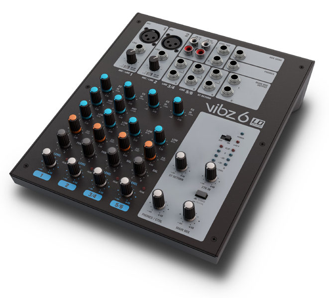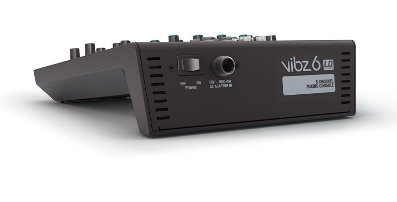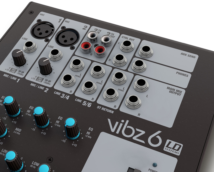 2 microphone channels with 3-band EQ 2 mono-compatible stereo line channels with 2-band EQ Master, Monitor and headphone outputs Securely fastening external power supply An adapter for mounting the VIBZ 6 on microphone stands are available as accessories