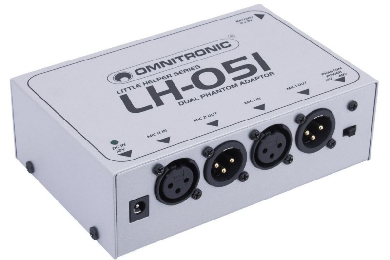 Phantom power for 2 microphones Phantom power supply for condenser or electret microphones Selectable +12/ +48 V power supply Ideal accessory for mixers without phantom power Inputs and outputs via balanced XLR connectors Operation via 2 x 9 V block battery or power unit (not included)