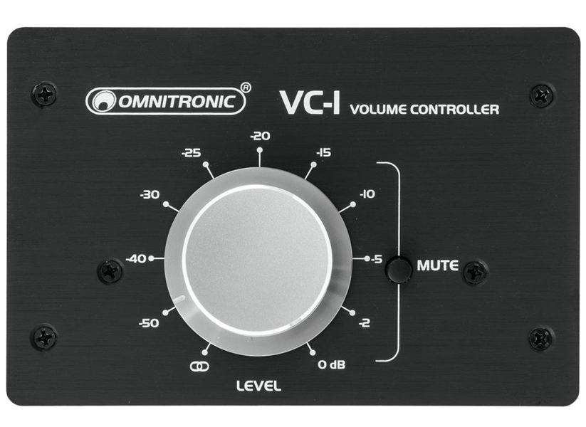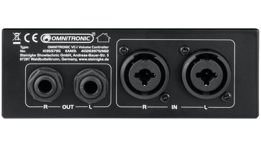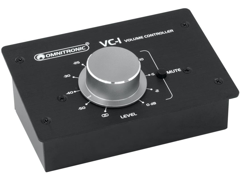 OMNITRONIC VC-1 Volume Controller passive Passive stereo volume controller Precise volume control of analog audio signals Suitable e.g. between PC sound card and active speakers or amplifiers 2 x combined XLR/6.3 mm jack input, balanced and unbalanced 2 x 6.3 mm jack output, balanced and unbalanced Large rotary level control Mute button Passive, requires no power supply Desktop console with brushed aluminum front panel