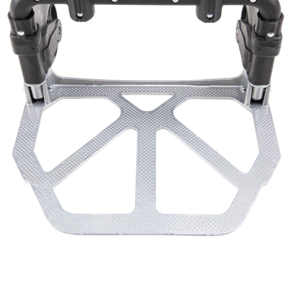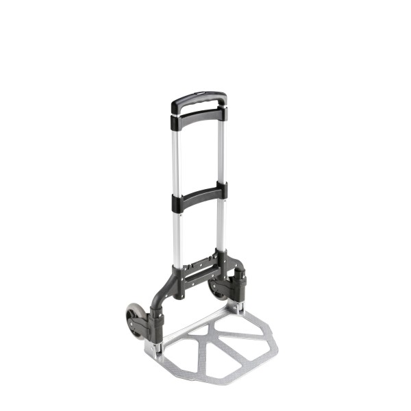 Folding Trolley with Locking Extension Handle Sturdy, light aluminium construction Lockable trolley handle Two 110 mm ball-bearing TPR castors Max. load capacity: 45 kg on level surfaces When running over obstacles (e.g. kerbstones and steps), the maximum load capacity is reduced accordingly Folds down to compact size