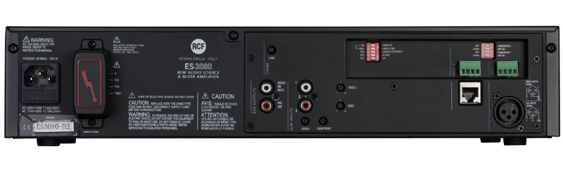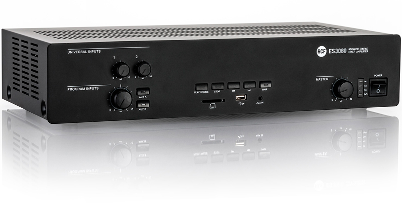 ES 3080 is an 80 W mixer-amplifier with a MP3 player directly accessible on the front panel. It can read USB sticks, SD cards, has an auxiliary input port with 3.5mm jack and Bluetooth technology for the connection with external sources