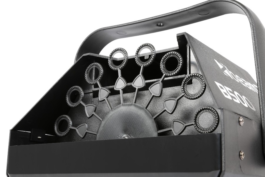 This small and attractive bubble machine creates a whirling effect thanks to the powerful blowerfan. The machine creates abundant bubbles per minute. It fits for family parties and small scale performances. Generates big bubbles throughout the room Large bubble wheel Powerful blowerfan Mounting bracket Low power consumption