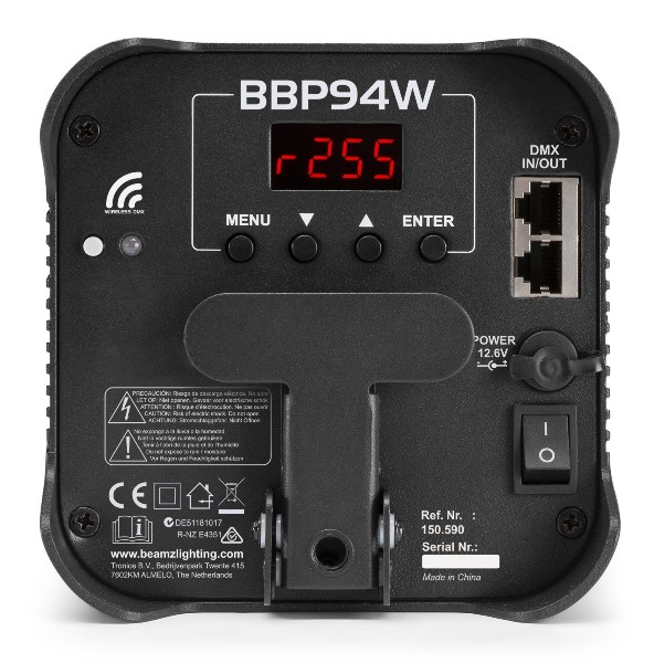 BBP94W is a battery operated par ideal for use as an uplighter. The BBP94W comes fitted with an 8Ah battery which will last over 9 hours when fully charged. The adjustable foot can be fixed in different angles for angular placement of the par. With built-in wireless-DMX receiver.