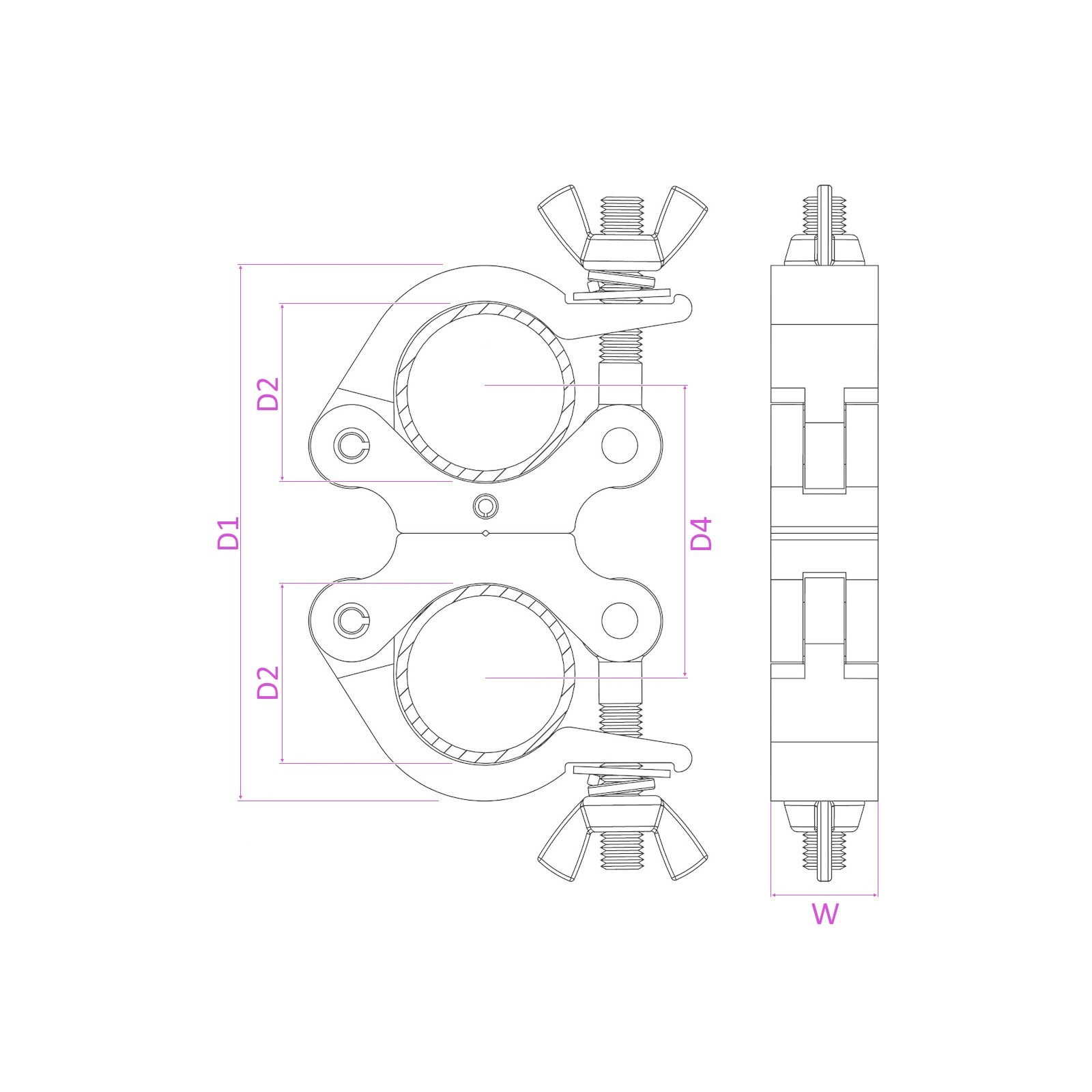 Heavy duty universal aluminium slimline swivel coupler for pipe and truss mounting fixtures. Swivel Coupler provides a firm fixing between adjacent bars whilst allowing 360 degrees of movement. High-strength aluminum construction.