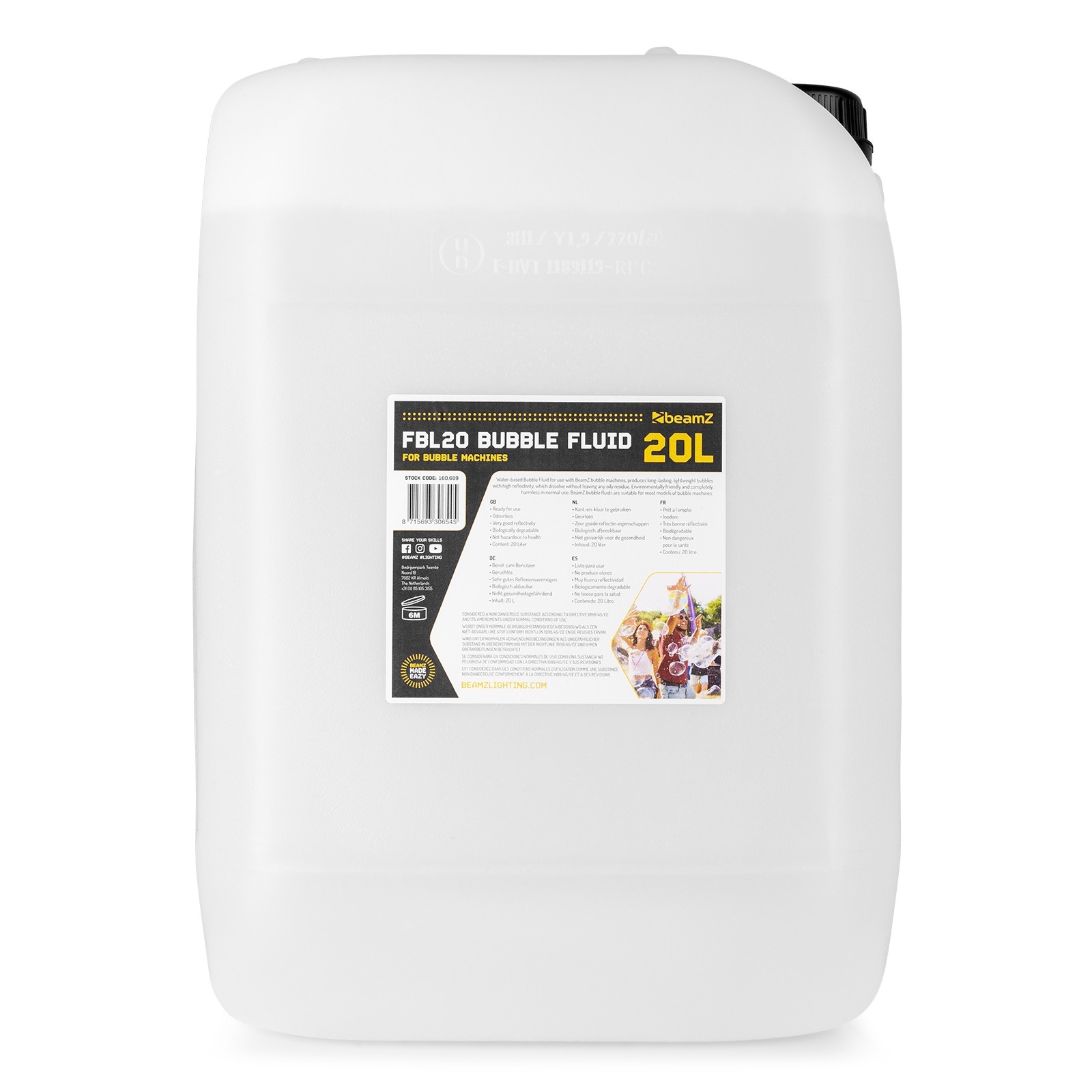 Water-based Bubble Fluid for use with BeamZ bubble machines, produces long-lasting, lightweight bubbles with high reflectivity, which dissolve without leaving any oily residue. Environmentally friendly and completely harmless in normal use. BeamZ bubble fluids are suitable for most models of bubble machines.