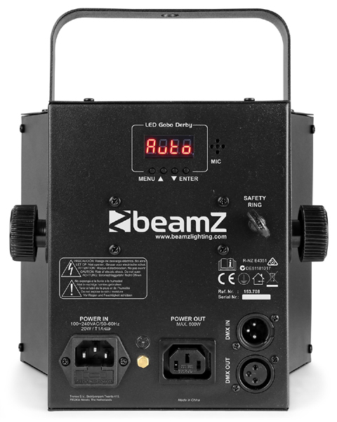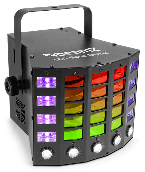 Gobo Derby is a versatile 3-in-1 fixture equipped with 8 x 3W RGBA LEDs, 8 x 3W UV LEDs and 5 x 3W white LEDs with strobe and wash effects. The Gobo Derby has been combined with a gobo wheel (8 gobos) to provide a truly spectacular lightshow ideal for small and medium-scale applications like for example home parties, small stages, decoration and so on. This compact and multifunctional fixture has DMX control, auto, sound activation and master/slave operational modes. A Goby Derby effect, ultraviolet light and a powerful strobe; Three functions in one fixture! Supplied with bracket and IR remote control.