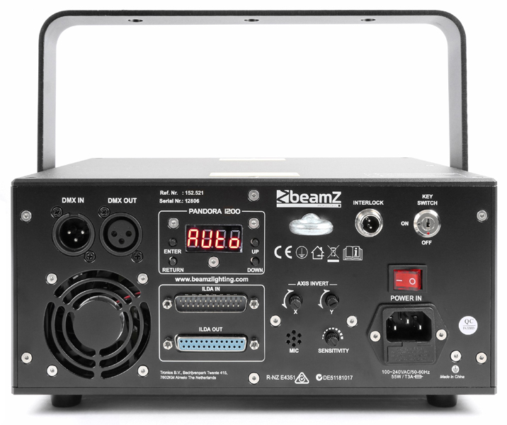 Tronios BeamZ PANDORA 1200 TTL LASER RGB Pandora 1200 has a guaranteed output power of 1W and a max output power of 1.2W full colour Red, Green and Blue. This show laser light provides a TTL modulation. It means that enables you to create 7 colours at their full intensity. Combining that much power with its precision 25K graphics scanners, whereby accuracy and beam shape is extremely advanced, so these units are suitable for high professional applications. The laser can be controlled over ILDA and DMX or run stand-alone in auto or sound activated mode