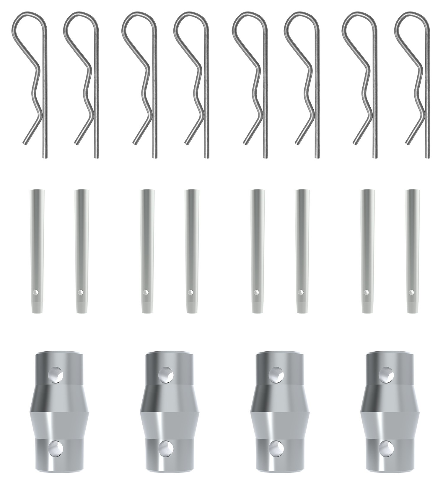 Set contains 4 conical couplers, 8 conical spigots, 8 safety spring