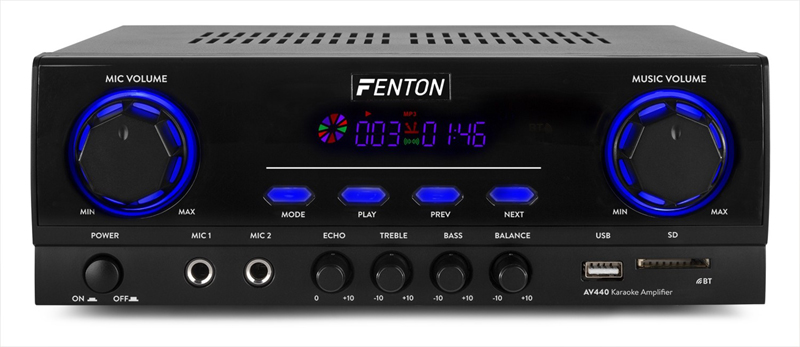 AV440 is a 2x 200W modern 2-channel karaoke amplifier equipped with a multimedia player and blue illuminated buttons. Provided with a remote control, two microphone inputs with tone control for Karaoke applications, echo control and a dynamic screen display. Also perfect for applications as HiFi and background music.