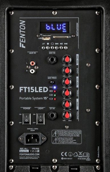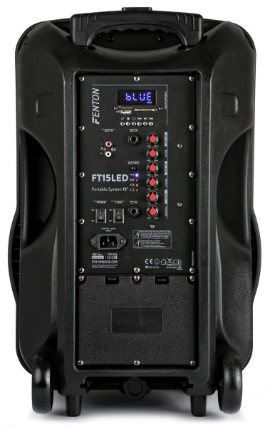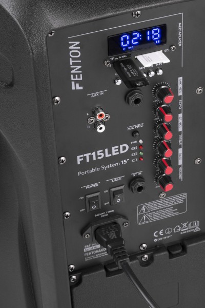 Tronios FENTON FT15LED Active Speaker 15″ 800W A complete 800W active speaker with BT connectivity. The speaker is ideal for small audiences and parties, schools or presentations. With the Bluetooth wireless technology users can simply connect their device and stream music effortlessly through the 800-watt speaker. The speaker comes equipped with a dedicated microphone input with volume and echo control and a guitar input to connect a guitar or other instrument.