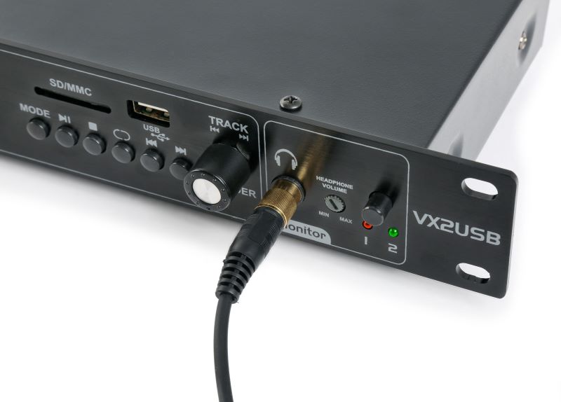 The VX2USB is a double USB/SD/BT player in a compact 1U housing with the ability to record the mixed output on either player. The left player is also suitable for streaming music from your phone or other mobile device. On the front side of the player is a headphone input for selectable monitoring of each channel. Ideal to be added to the 19″ rack of any club, bar or cafe.