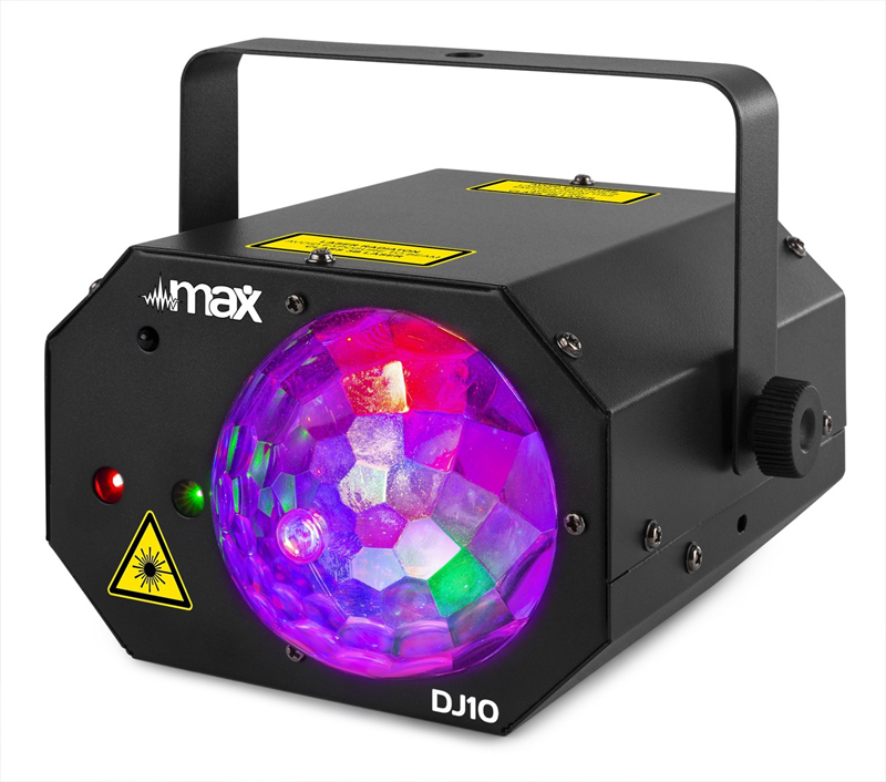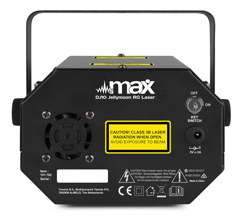Tronios MAX DJ10 JELLY MOON WITH RED/GREEN LASER Max DJ10 is equipped with a Jelly Moon for various stunning light effects in combination with a powerful red and green laser. The Jelly Moon creates space-filling moving colourful beams powered by three LEDs in the colours red, green and blue. The two lasers create a star sky with figures and thousands of twinkling laser dots in red and green. Thanks to the automatic program, this light fixture is ideal for use at parties, bars, at home, etc.