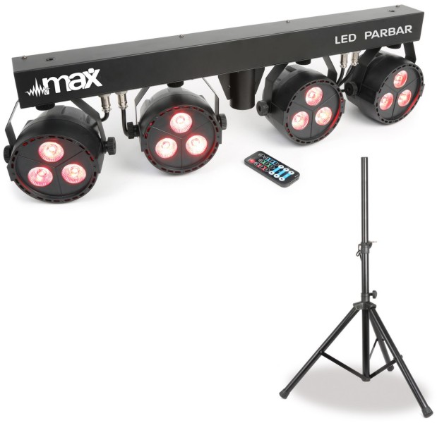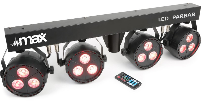 Tronios MAX PARTYBAR4 LED PARBAR 4-WAY 3X 4-IN-1 RGBW A kit of 4 LedPARs on a T-bar with the possibility to mix RGB with Cool White to achieve extraordinarily beautiful solid colours. Because of the 4-in-1 technology and very high power of the individual LEDs we can achieve a very high output with a minimum quantity of LEDs. The lenses on the front mix all colours perfectly without creating shades in the output. The T-bar have been carried out in a compact casing that can fit almost anywhere. The system includes a remote control that simplifies operation and eliminates the bother of programming. Or you can choose to control with an external DMX controller via its XLR In/Outs. The rugged housing is specially designed for stages, disco, night clubs etc.
