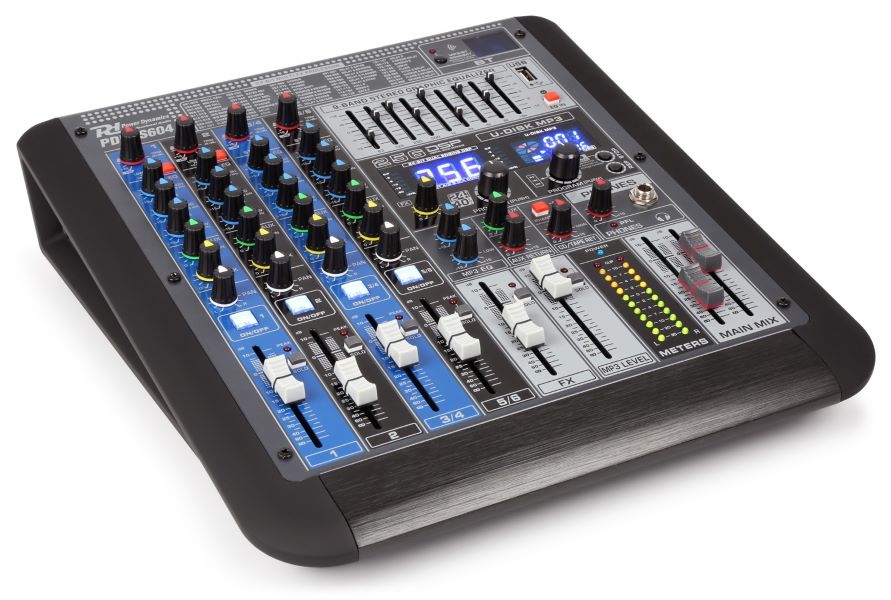 A 6 channel professional mixer with built-in USB player and BT receiver. Perfect for use on live stage setups, houses of worship or other multi-input venues. 4 Balanced microphone XLR inputs 4 Balanced Line inputs 6.3mm Jack (mono) 1 Balanced stereo line input 2x 6.3mm Jack +48V phantom power Stereo line input (RCA) 75Hz Low cut filter channel 1-2 Multi-FX processor with 256 presets Solo switch per channel (PFL) On/off switch per channel Hi, Mid and Low control for each channel Adjustable FX, Pan, Trim per channel Aux send per channel 9-band Equalizer Stereo balanced main outputs (XLR + 6.3mm Jack) Separate control room, headphones and stereo rec outputs Built-in USB player with digital display BT-receiver for audio streaming LED VU meter and Peak LED’s Supplied with telephone holder