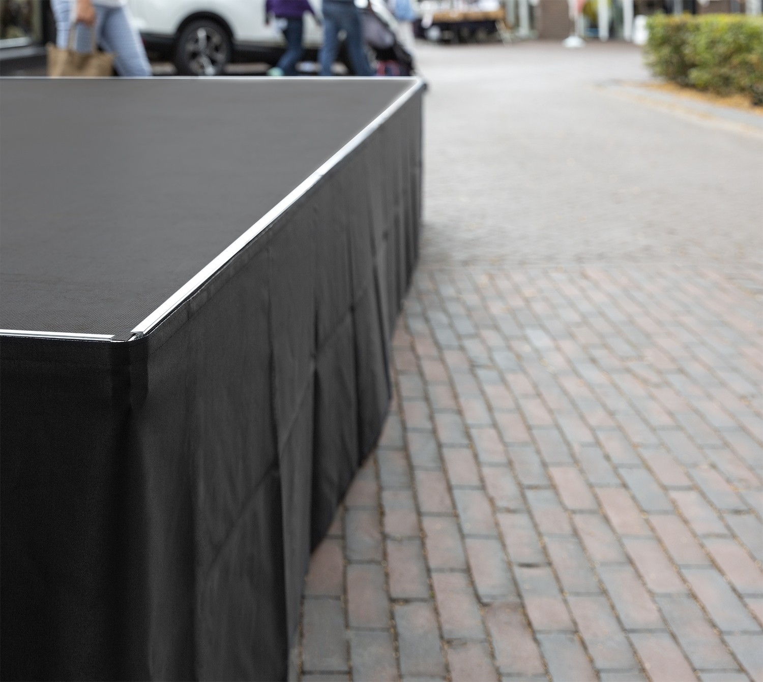High quality polyester straight skirt for fixing to aluminium stage decks. Equipped with hook-and-loop fastener for quick and easy assembly.