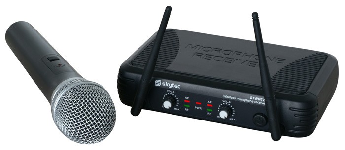 Tronios SKYTEC STWM722C 2-Channel UHF Wireless Microphone System A dual-channel UHF Wireless Microphone System with antenna-diversity featuring handheld microphone and bodypack transmitter with headset microphone. Both transmitters work on different frequencies. Good sound quality and reliable due to the diversity technique. Ideal for on stage, vocalists, presentations etc.