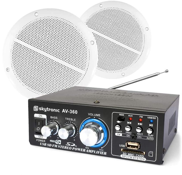 2x 40W amplifier MP3 player with USB port and SD slot External voltage supply: 12Vdc / 5A Overload protection Remote control Treble/Bass/Volume control Ideal for marine use or PA installations such as swimming pool areas, bathrooms etc. Dual Cone speakers Spade terminal connections Includes fixing kit IP44 rated 6.5″ Woofer with polypropylene cone