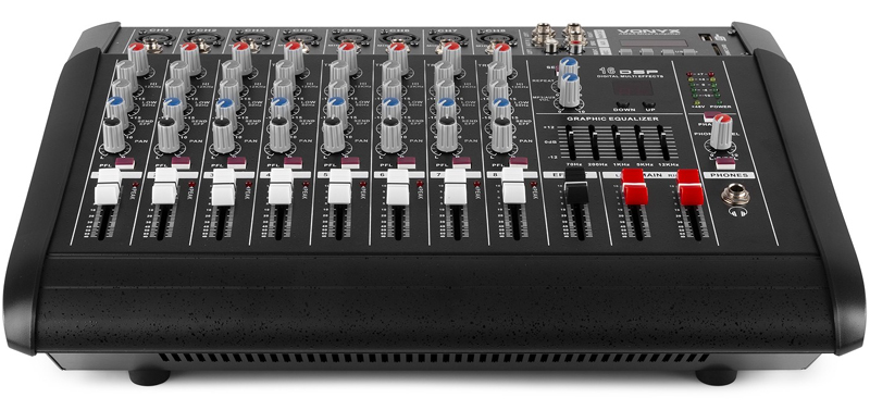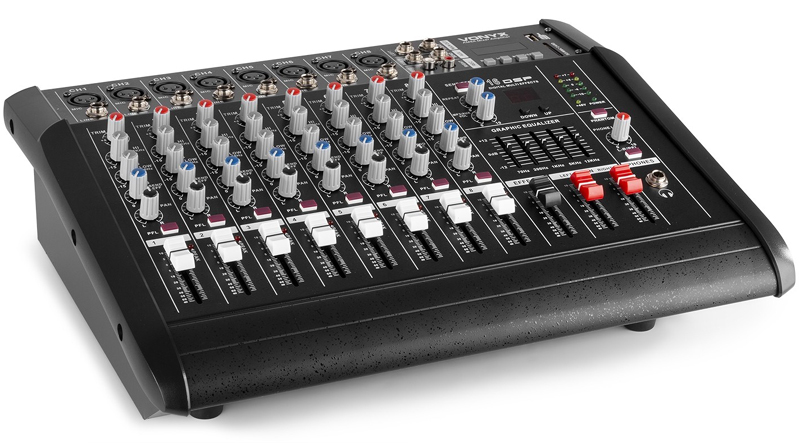 This 8-channel mixer holds a 2x 500W amplifier. Giving the user a complete unit as base for this setup. With 8 mono microphone and line inputs it’s ideal for live performers on stage. 16 digital effects give you plenty of room to fine tune your sound
