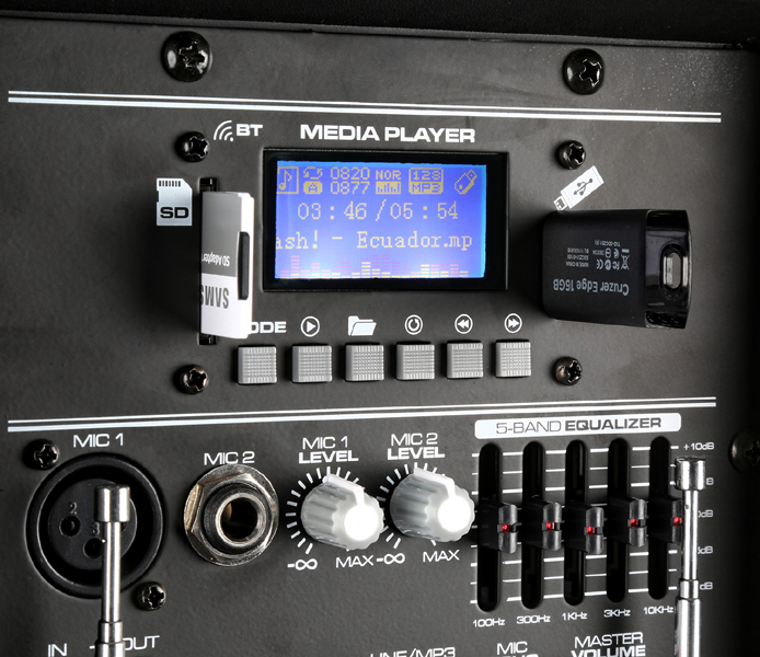 A professional 15″ 800W Portable speaker with remote control, an integrated USB port and SD slot for playing MP3 files. This “all in one” system is equipped with a BT receiver for audio streaming and one UHF wireless body-pack. Operates via the mains or a 12V built-in rechargeable battery and can therefore also be used outside efficiently. Comes with retractable handle and wheels. At the rear there are two microphone inputs and an echo effect for all microphones, AUX line-input, MP3 control panel, controls for tone adjustment etc. This complete system is indispensable where a good audio reproduction is desired.