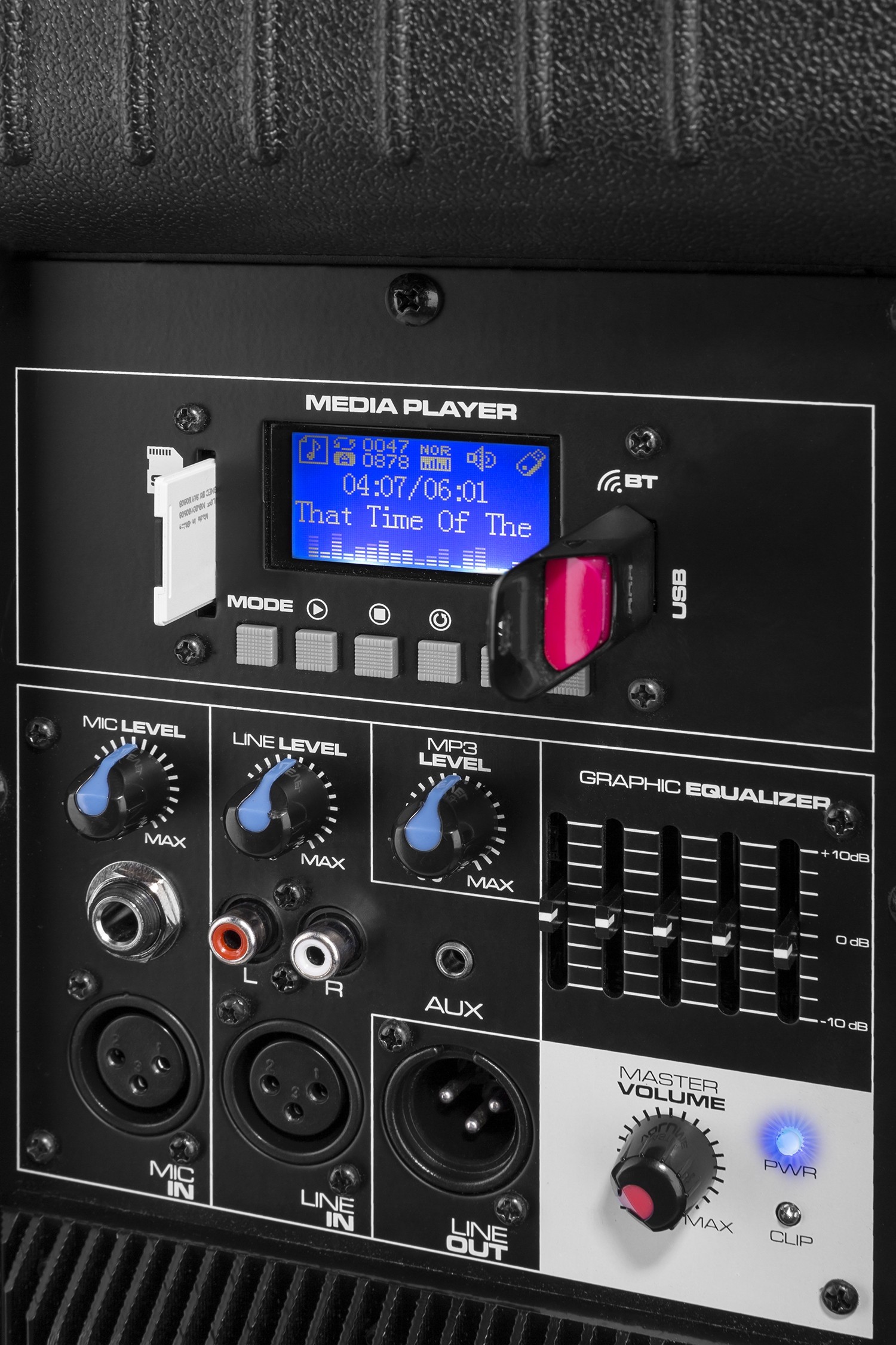Playback options: BT streaming, USB, SD, Line input, Microphone (input)