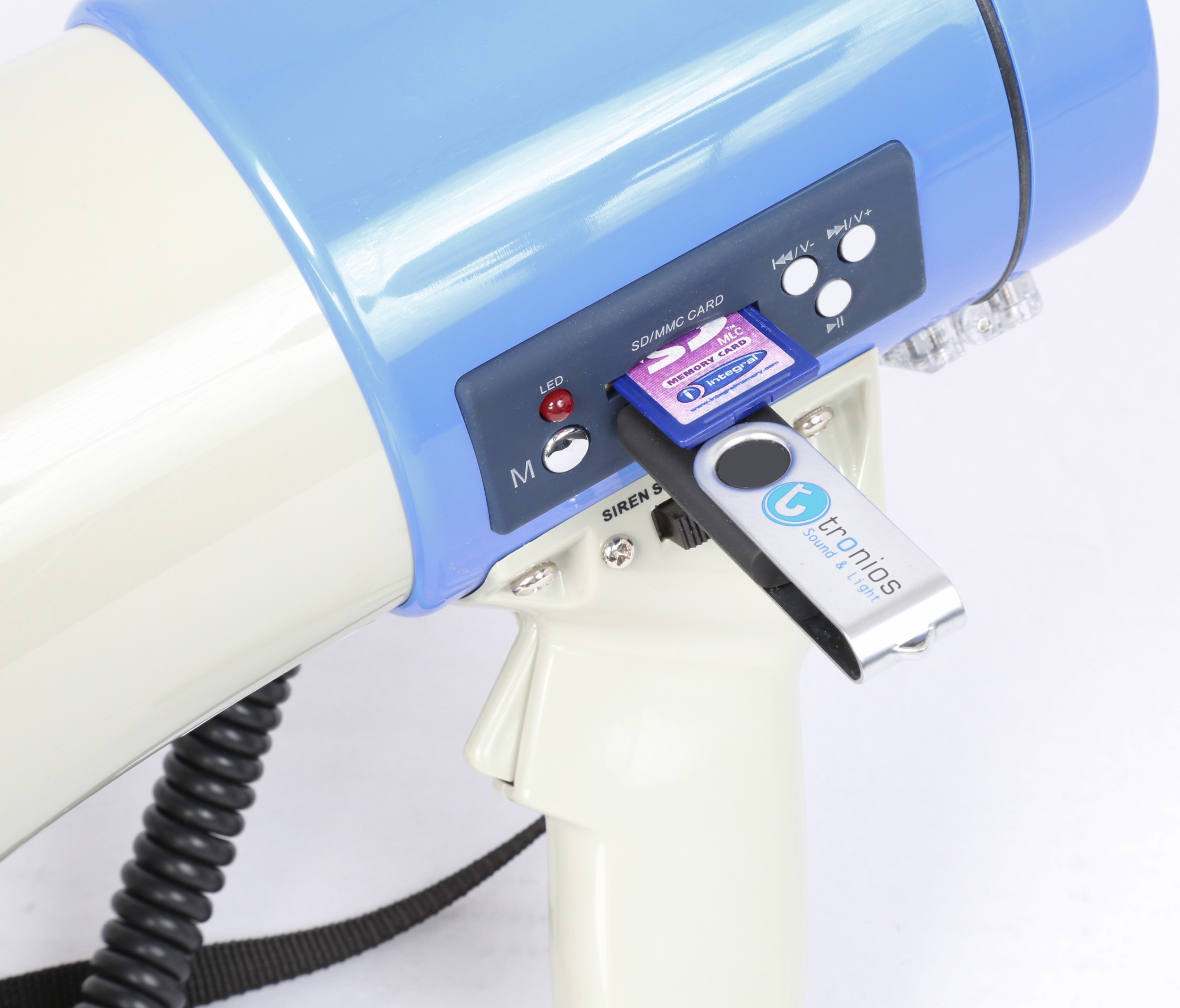 Powerful megaphone with built-in 60W amplifier with detachable anti howl microphone on coiled lead. Features USB and SD slots, a siren function, volume control and adjustable shoulder strap. Distance 1.0 – 1.2 km depending on the operating conditions.