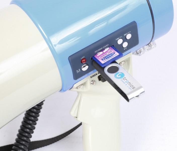 Powerful megaphone with USB port and SD slot, lithium battery, MP3 control panel, built-in 65W amplifier and detachable anti-feedback microphone with coiled lead. Siren function, volume control and adjustable shoulder strap. Distance 1.0 – 1.2 km depending on operating conditions.