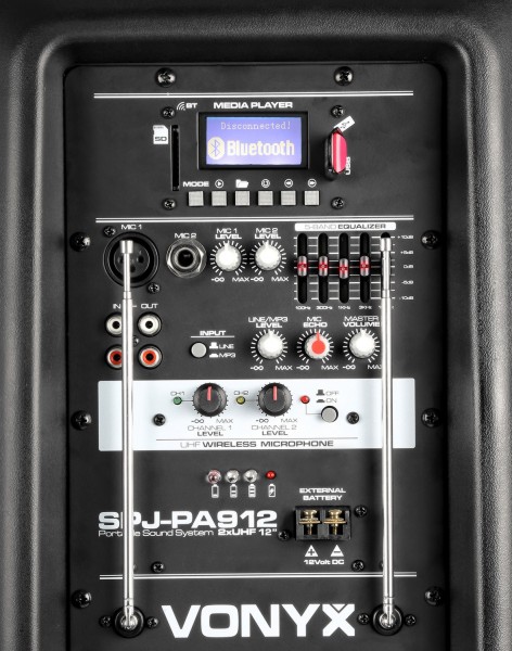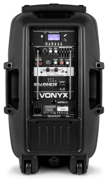 Tronios VONYX SPJ-PA912 Portable Sound System ABS 12″ 2 UHF/USB/MP3 A professional 12″ 500W Mobile Sound System featuring 2 UHF wireless microphones operating on different frequencies, remote control and integrated USB and SD slots for MP3 playing. This all in one system operates via mains or a 12V internal rechargeable battery, powering a 12″ main driver and a 1″ HF driver. On the back there are 2 inputs and an echo effect for wired microphones, AUX line input, MP3 control unit, 5 controls for tonal adjustments etc. Due to this exciting system, premises and areas can be filled with an ear pleasing sound.