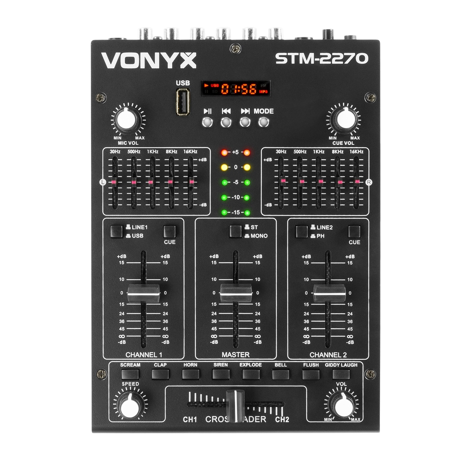 4-channel compact mixer ideal for start up DJs or small gigs. The STM2270 combines technical features with a table top design. Among the features are a BT receiver and MP3 player. As extra the STM2270 is equipped with 8 fully customizable effects.