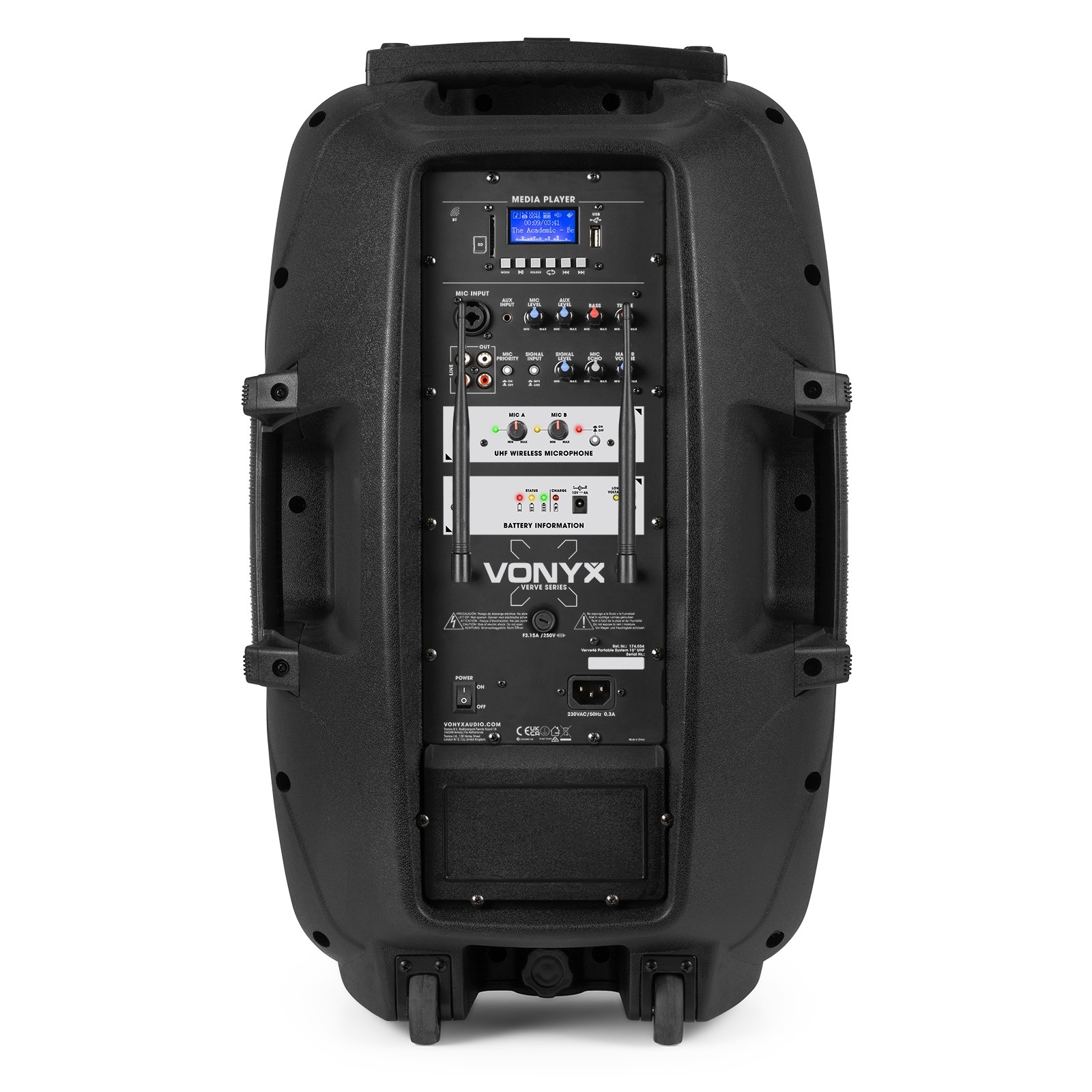 Included accessories: Handheld microphone (wireless), Remote control (wireless)