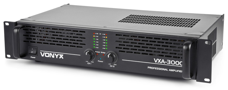 Tronios VONYX PA AMPLIFIER VXA-3000 2 x 1500W High quality 2 x 1500W stereo amplifier Stereo and bridge mode Clip LEDs for indicating overload Ground lift switch Perfect DC output protection 19″ rack mountable RCA and 6.3mm Jack inputs NL2 speaker connectors, 6.3mm Jack and terminal outputs