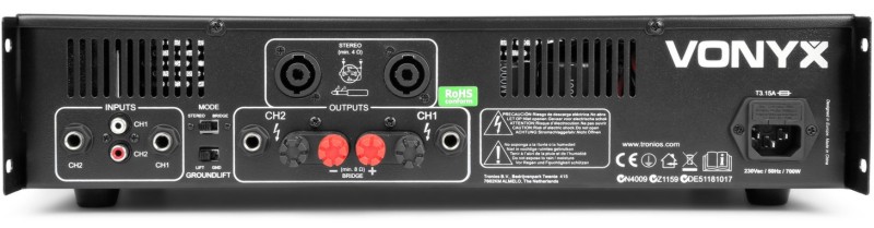 Tronios VONYX VXA-800 II pojačalo snage 2 x 400W A high standard 2x400W stereo amplifier using a more stable circuit with SMT technology standing for a high power output. With low noise level and wide frequency response. Excellent quality-price ratio. Suitable for 19″ rack-systems. Perfect for use in discos, bars, clubs, on stage etc. High quality 2x400W stereo amplifier Stereo and bridge mode Clip LEDs for indicating overload Ground lift switch Perfect DC output protection 19″ rack mountable RCA and 6.3mm Jack inputs NL2 speaker connectors, 6.3mm Jack and Terminal outputs